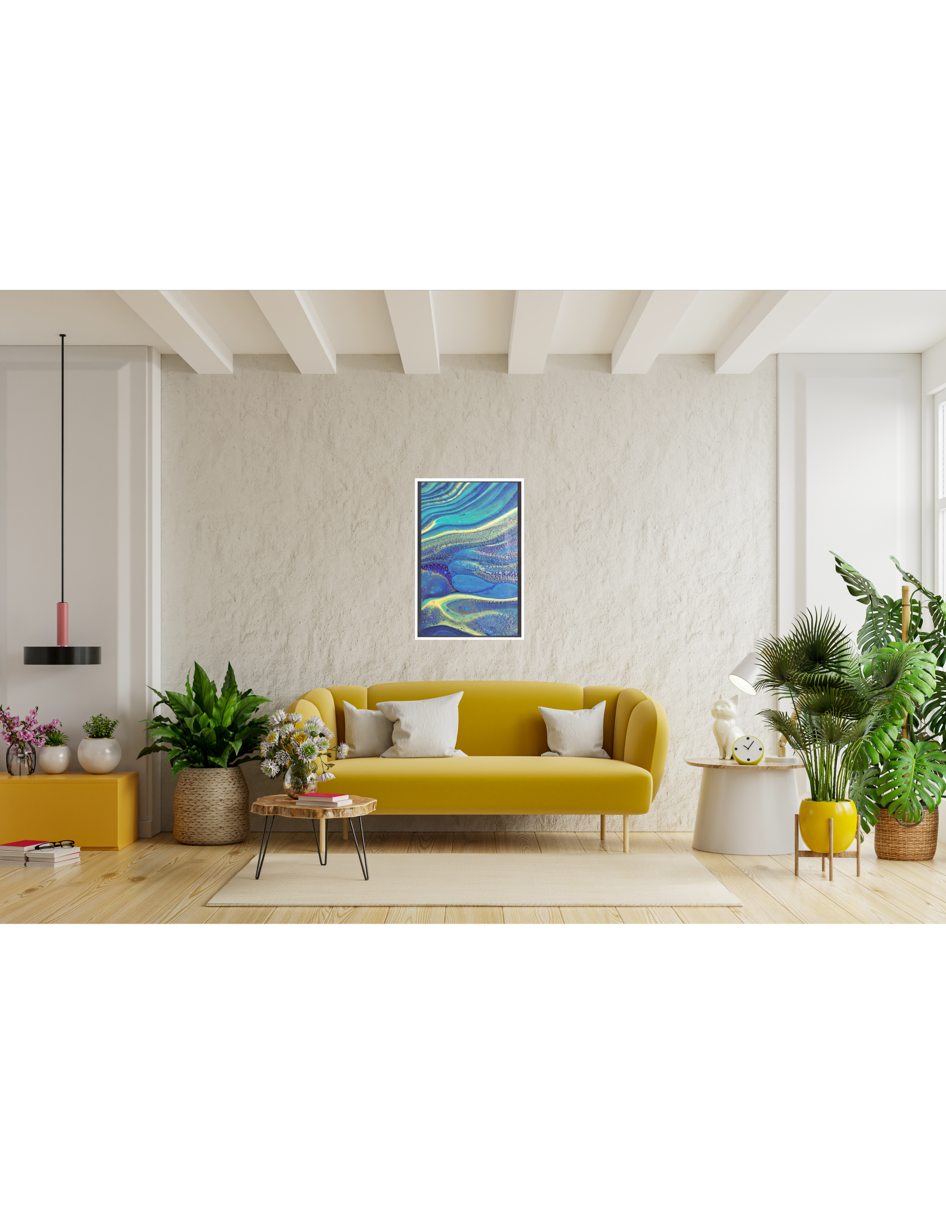 Ribbons of cobalt, teal, and chartreuse glide across the surface like moonlit waves. Fine, sandy textures and soft celling give Bioluminescent Tide an easy, coastal motion—calm yet energetic. A versatile abstract that brightens modern, minimal, or beach-inspired spaces.