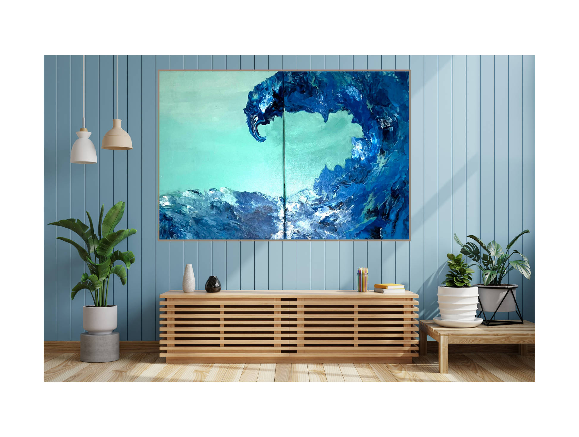 Two panels capture the instant a deep-blue swell gathers, curls, and bursts into spray. Layered pours and palette-knife textures build an ocean of cerulean, ultramarine, and teal, while the vertical seam between panels adds tension—like the split second before the wave breaks. Energetic yet meditative, Breakin’ brings movement, salt-air light, and coastal calm to any space. Part of Pulse & Pigment | A Curated Color Collection.