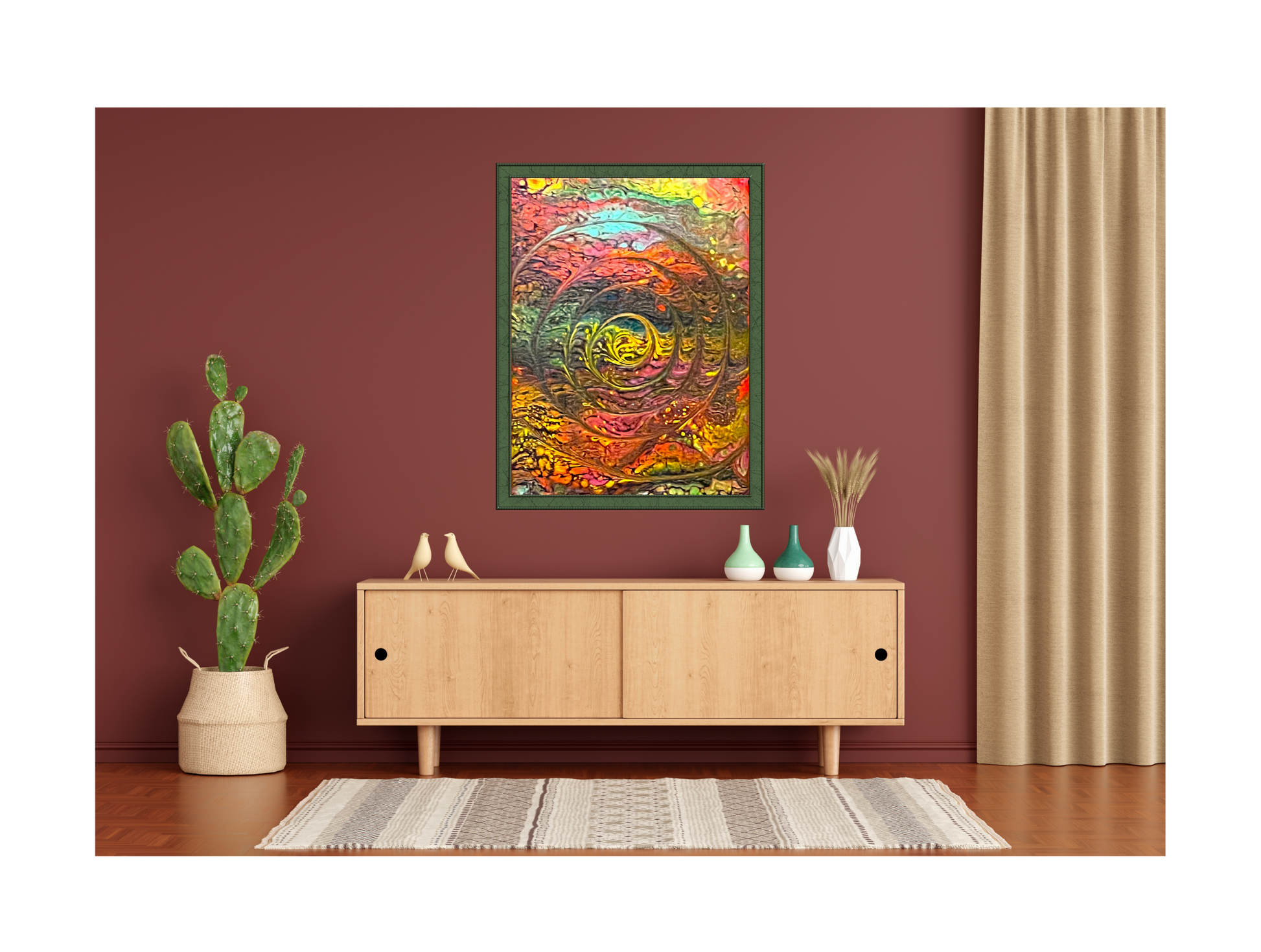 A luminous spiral draws you inward—ember reds and golds bloom at the core while ribbons of teal, magenta, and smoke swirl outward in motion. Painted in the Pulse & Pigment style, this piece balances energy and calm, making a striking focal point for modern spaces on canvas or poster.