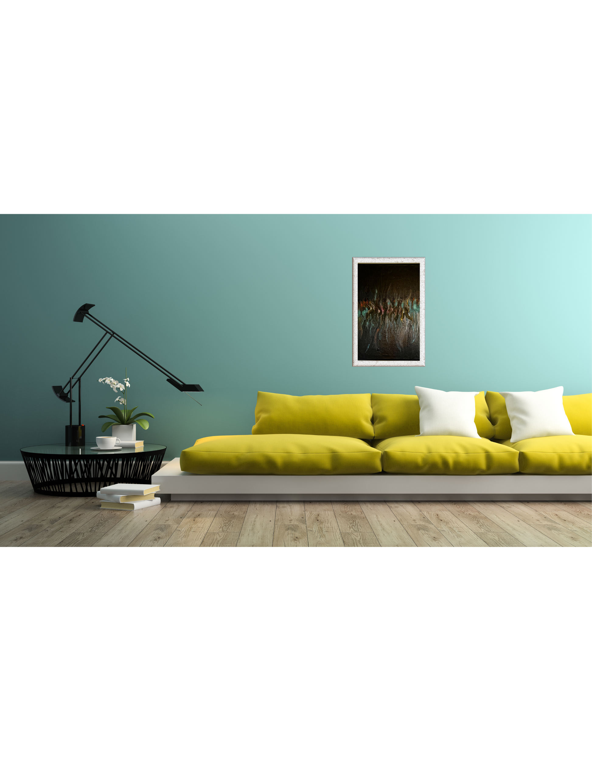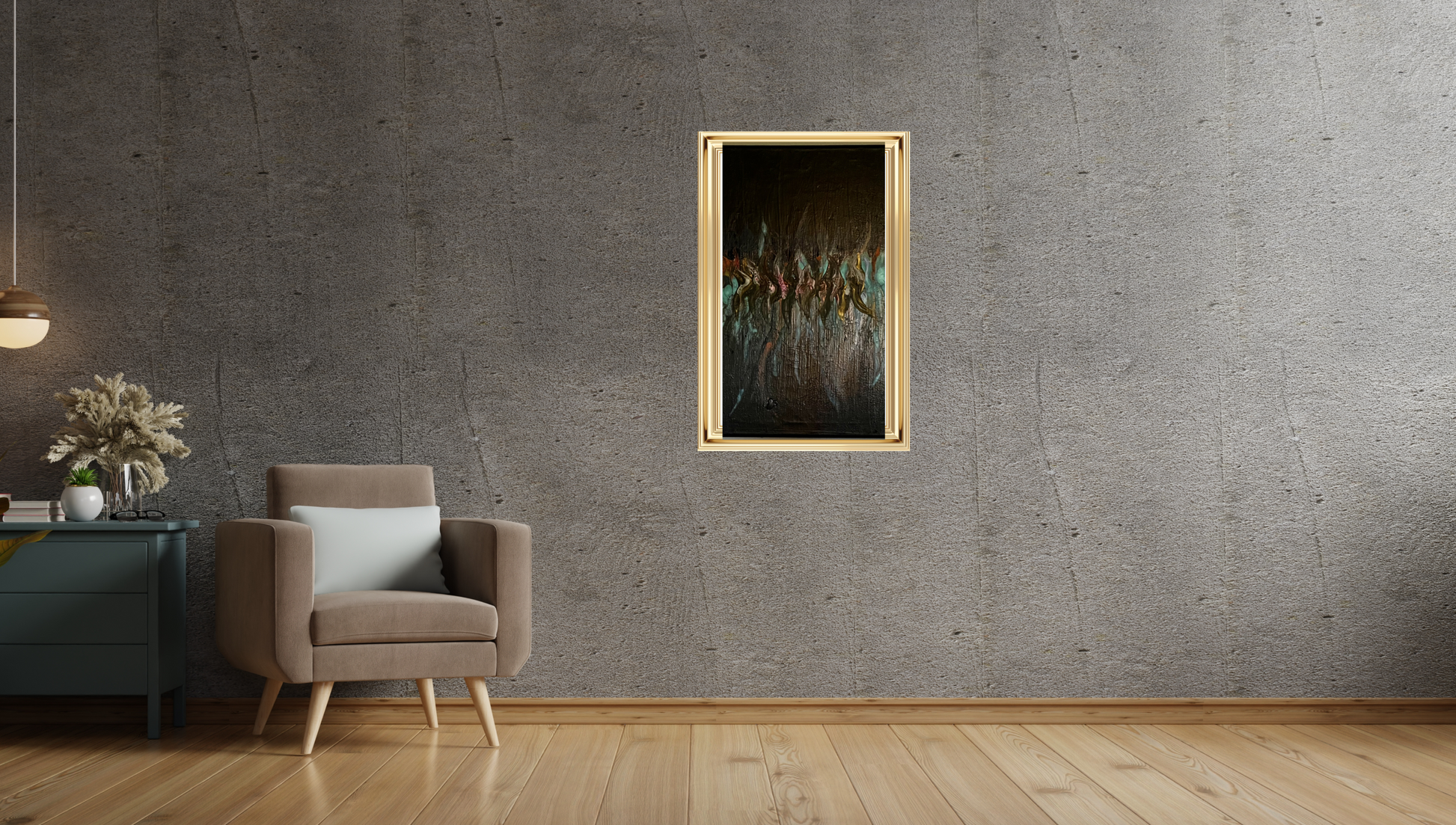A procession of figures emerges from a dark field, lit by ember, turquoise, and gold—like dancers caught at the edge of the spotlight. Textured strokes and vertical drips create motion and music you can almost hear, turning shadow into rhythm. A striking statement piece for moody, modern spaces.