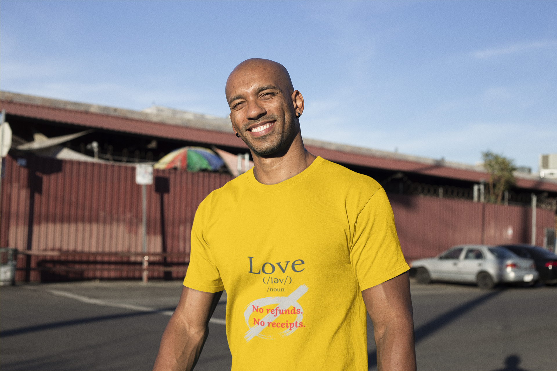 From the Love Is collection, this tee lays it out with a wink: love isn’t a transaction—it’s a commitment. The dictionary-style header sits over a bold “no refunds, no receipts” message for anyone who’s all-in and unapologetic. Clean, unisex-friendly, and perfect for date night or daily wear when you want your shirt to do the talking.